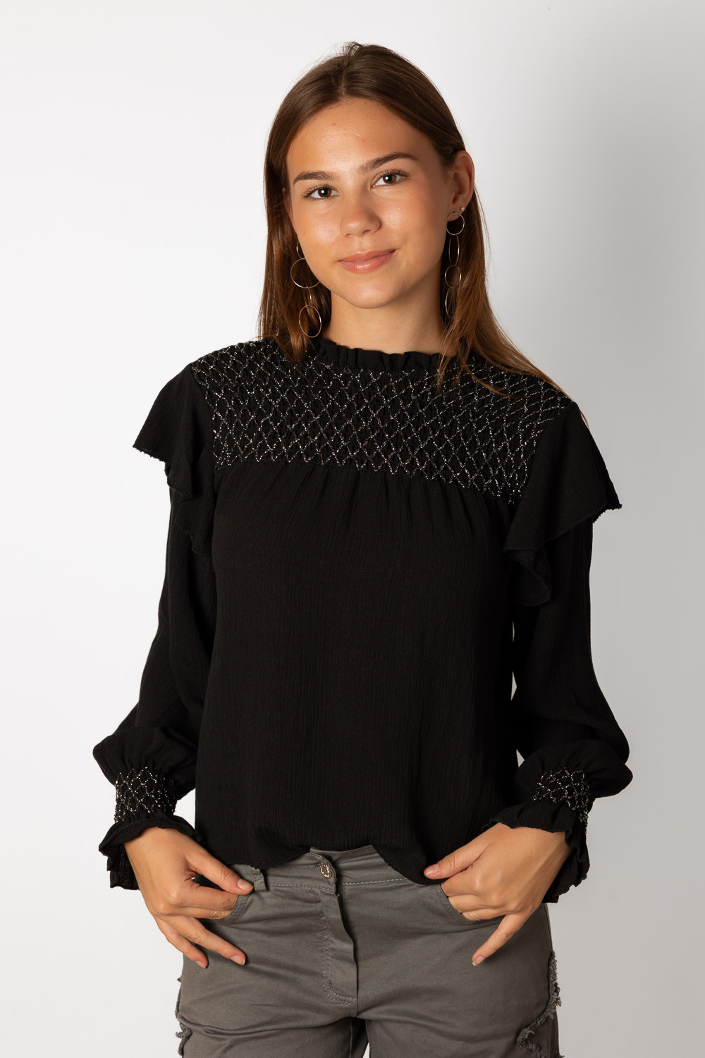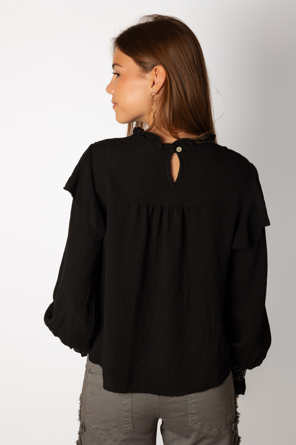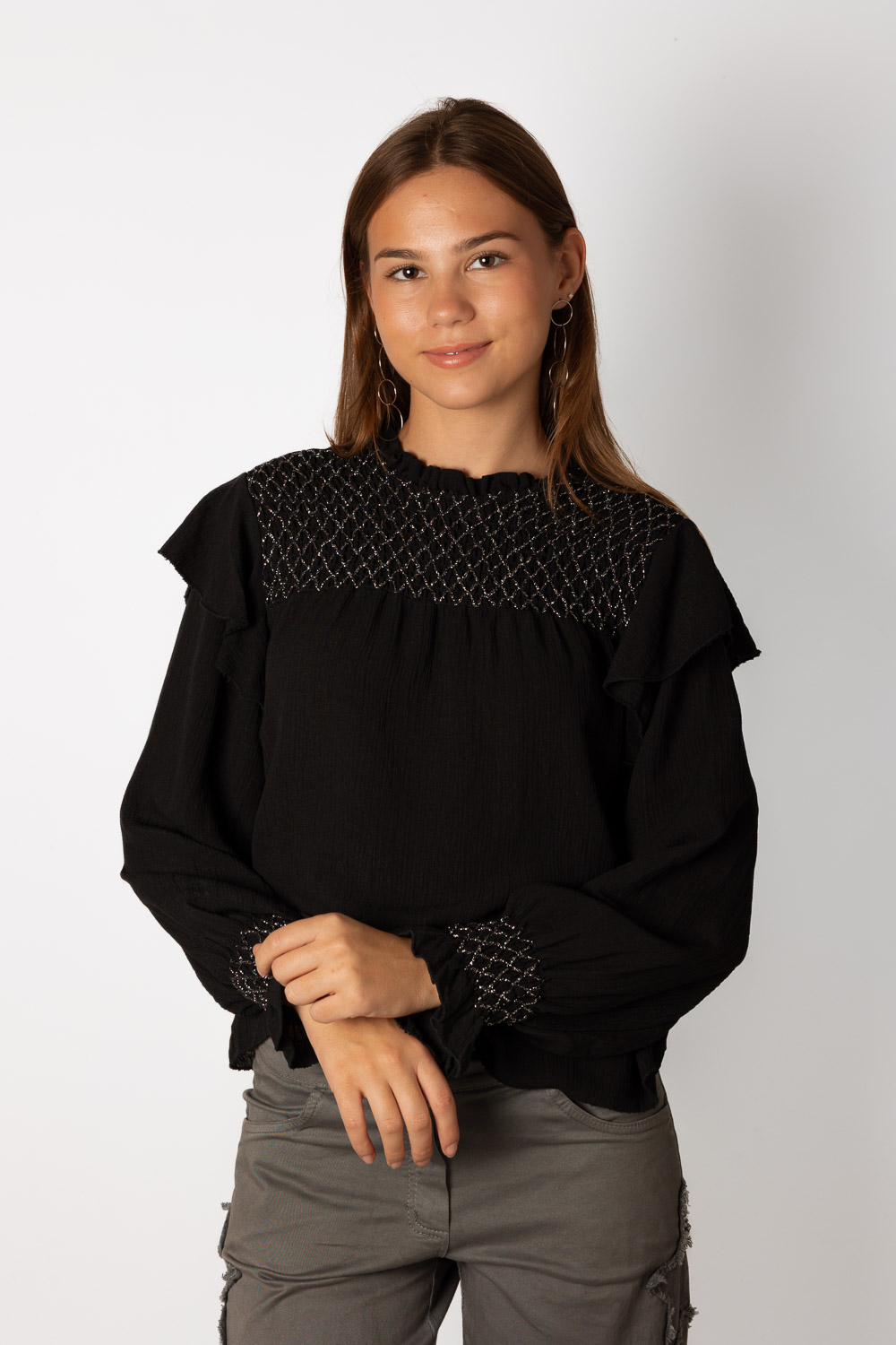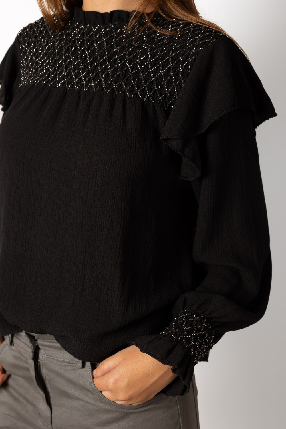 Blusa bambula en color negro! Una de las más especiales de la Colección de Otoño porque es sencilla pero con algo especial. El canesú con nido de abeja y bordado en hilo plateado la hacen una blusa diferente y que llama la atención. Los volantes de los hombros la hacen muy elegante, el cuello es cerrado y se anuda con botones en la espalda. Es muy ponible.