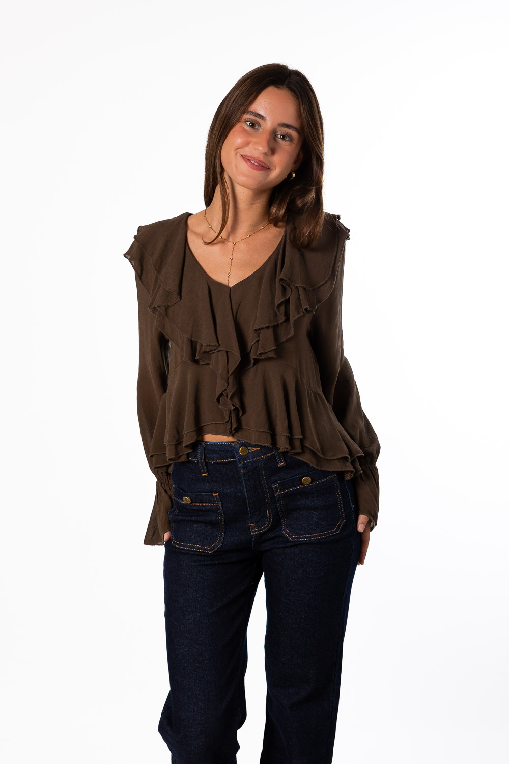 Blusa de gasa con volantes, muchos volantes. ¿Puede ser más bonita? Escote en pico, volantes en toda la zona delantera e incluso en las mangas. Si eres fan de las prendas lisas pero necesitas que tengan algo especial, ¡es esta blusa! Además, en el color más trendy de la temporada: el marrón.
