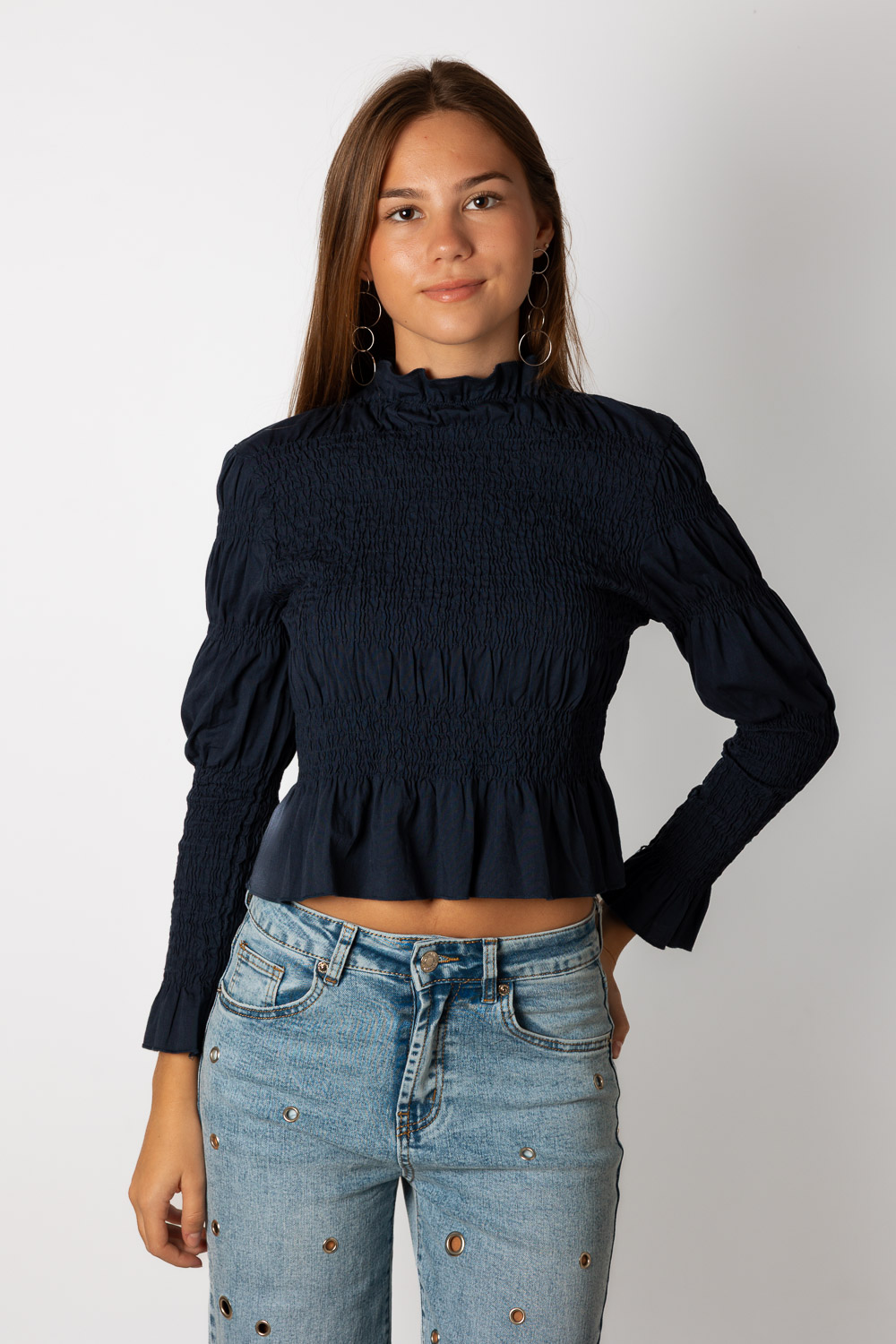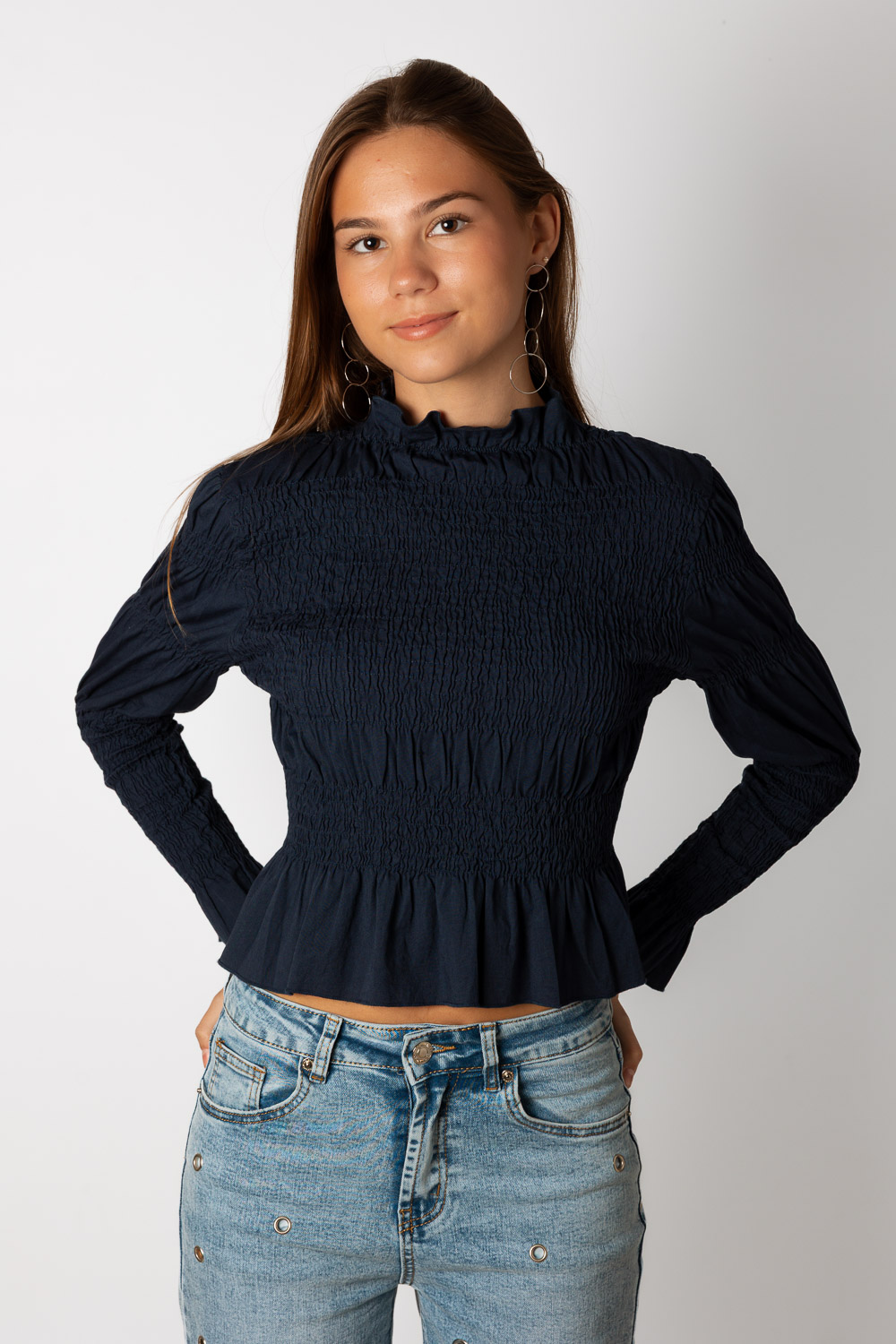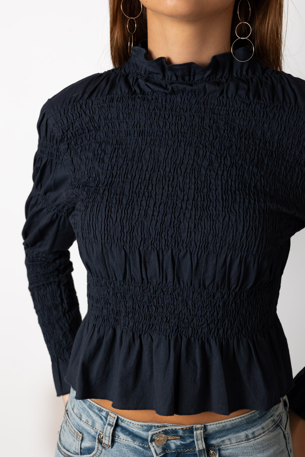 Blusa de manga larga súper fruncida color azul. El patrón con nido de abeja tanto en cuerpo como mangas y las mangas ligeramente abullonadas son ideales. ¡Hazte con ella porque es edición limitada!  Combínalo con nuestros pantalones.