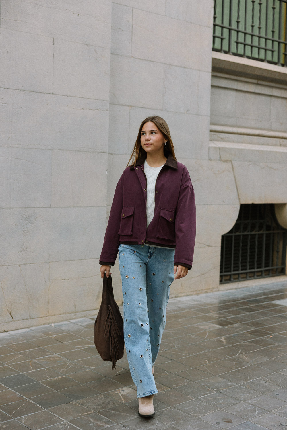 Chaqueta estilo bomber acolchada color vino, con solapa y puños en contraste en micropana marrón.