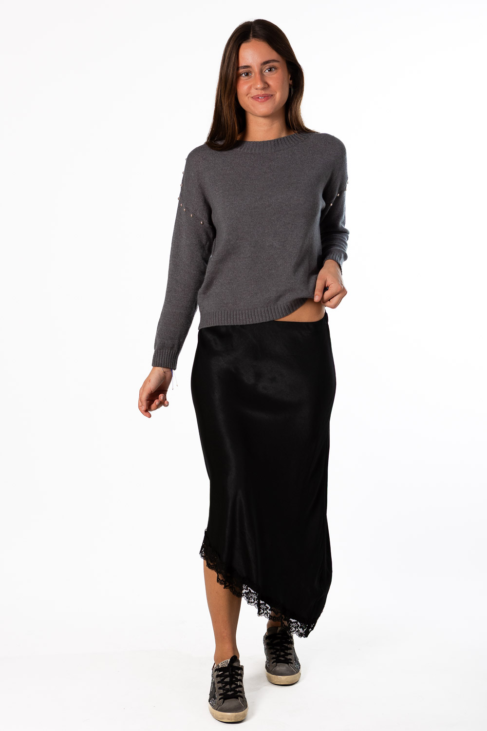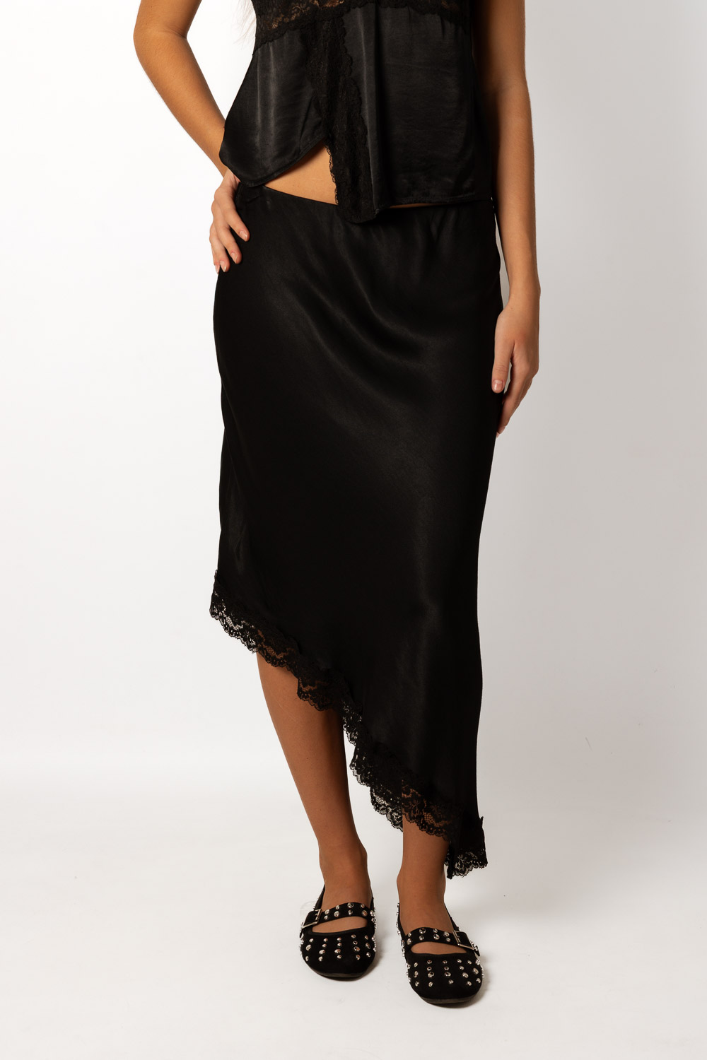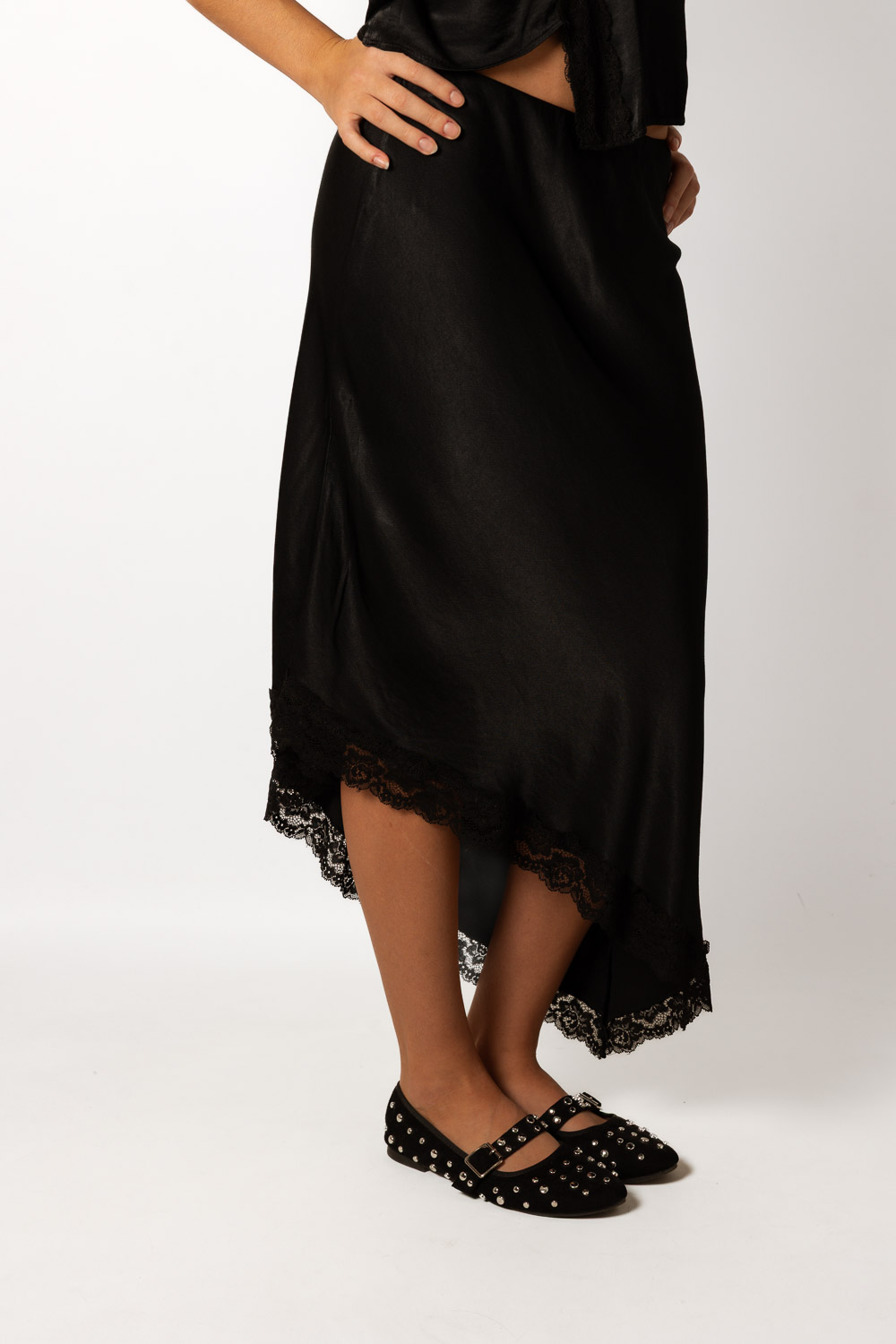 Falda midi de raso con encaje en color negro. Cintura con goma elástica, caída con vuelo fluido que aporta movimiento al andar, tacto raso muy gustoso y tiene su top a juego! Un dos piezas para quien apuesta por un look original que además podrás combinar también por separado y para diferentes ocasiones.