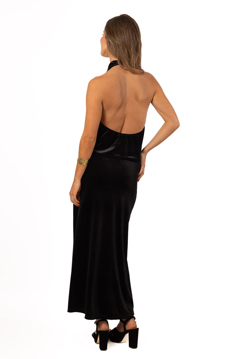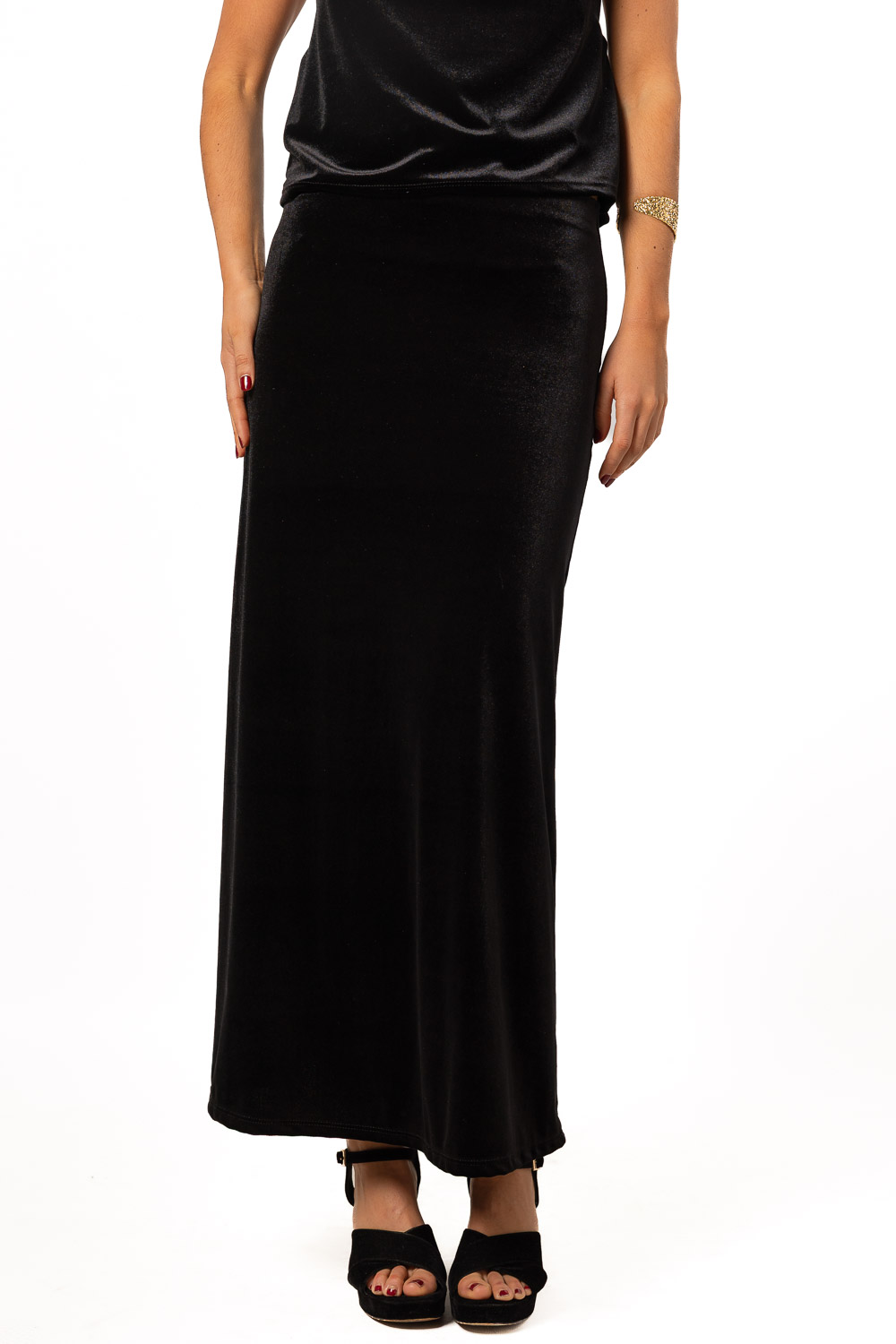 Falda midi de terciopelo negro. ¡Llévala con el top Halter de terciopelo negro a conjunto y tendrás el total look más elegante de estas fiestas! Es talla única. Lleva goma elástica en la cintura para que ajuste a la perfección. El tejido es elástico, suave, súper agradable al tacto.