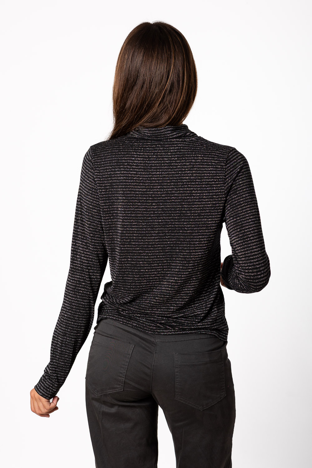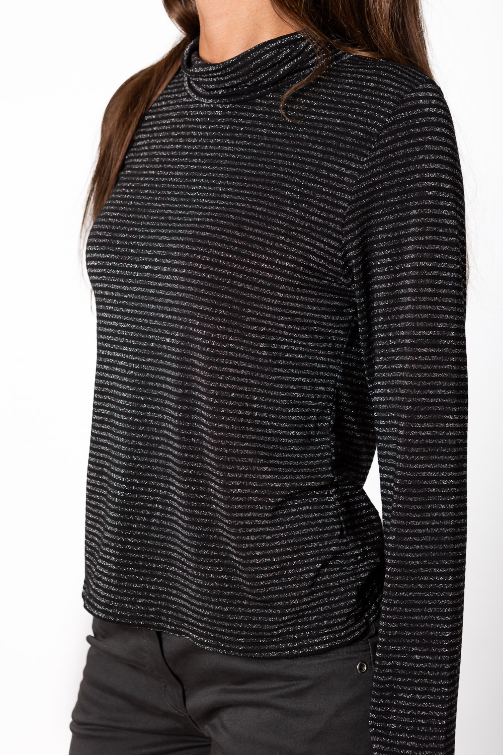 Jersey fino de un tejido muy gustoso, con tejido de rayas horizontales finas y brillito. Lleva cuello alto pero muy sutil.