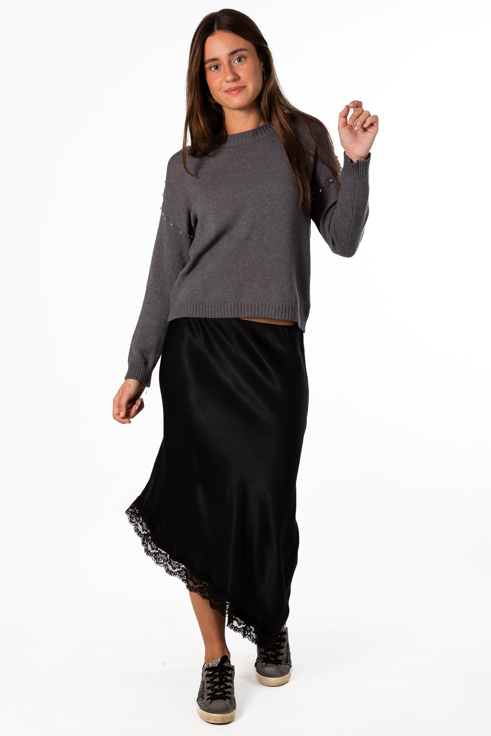 Jersey súper gustoso con detalle de tachuelas en las mangas y cuello. ¡No puede ser más tendencia!