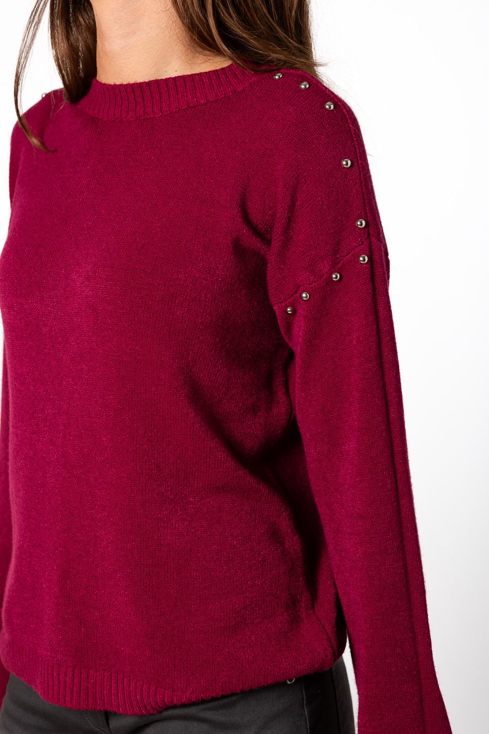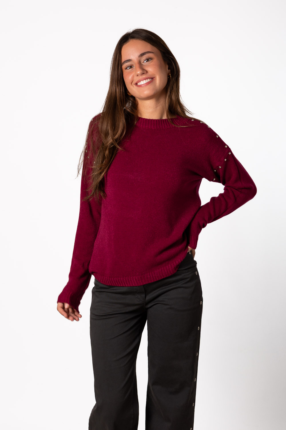 Jersey súper gustoso con detalle de tachuelas en las mangas y cuello. ¡No puede ser más tendencia! Color muy atractivo que resaltará tu color de piel.