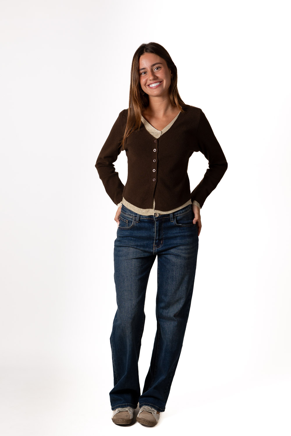 Jersey doble estilo cardigan en color marrón y beige. ¡La tendencia de la temporada, los jerséis en doble! ¿Os gusta? No paramos de verla y no nos podía faltar en nuestra colección. Es ideal para combinar con tus pantalones de tiro bajo y conseguir un look relajado y con rollo.