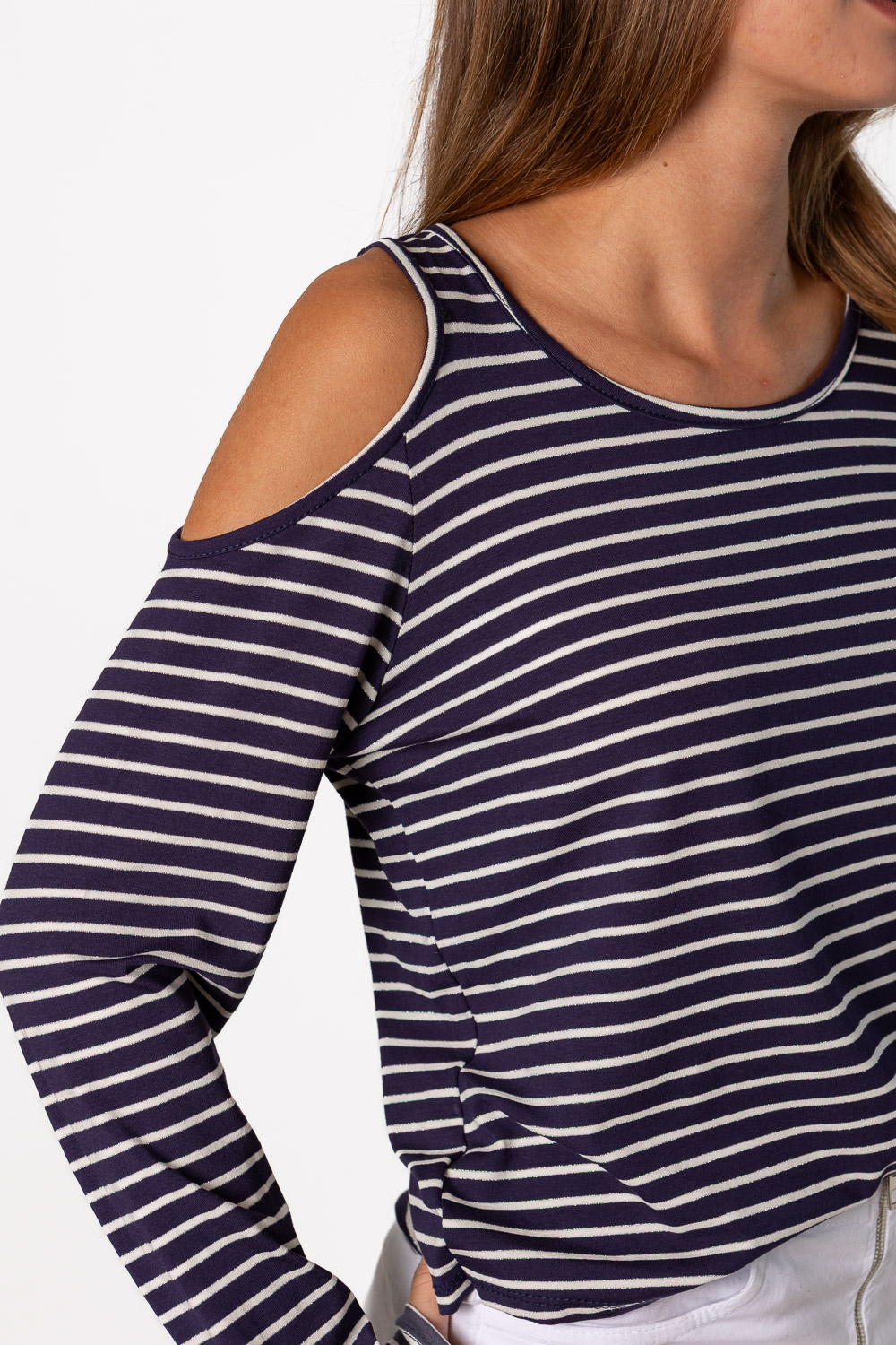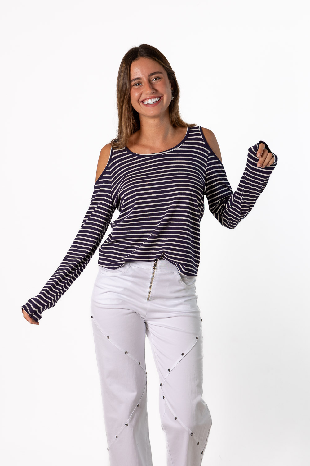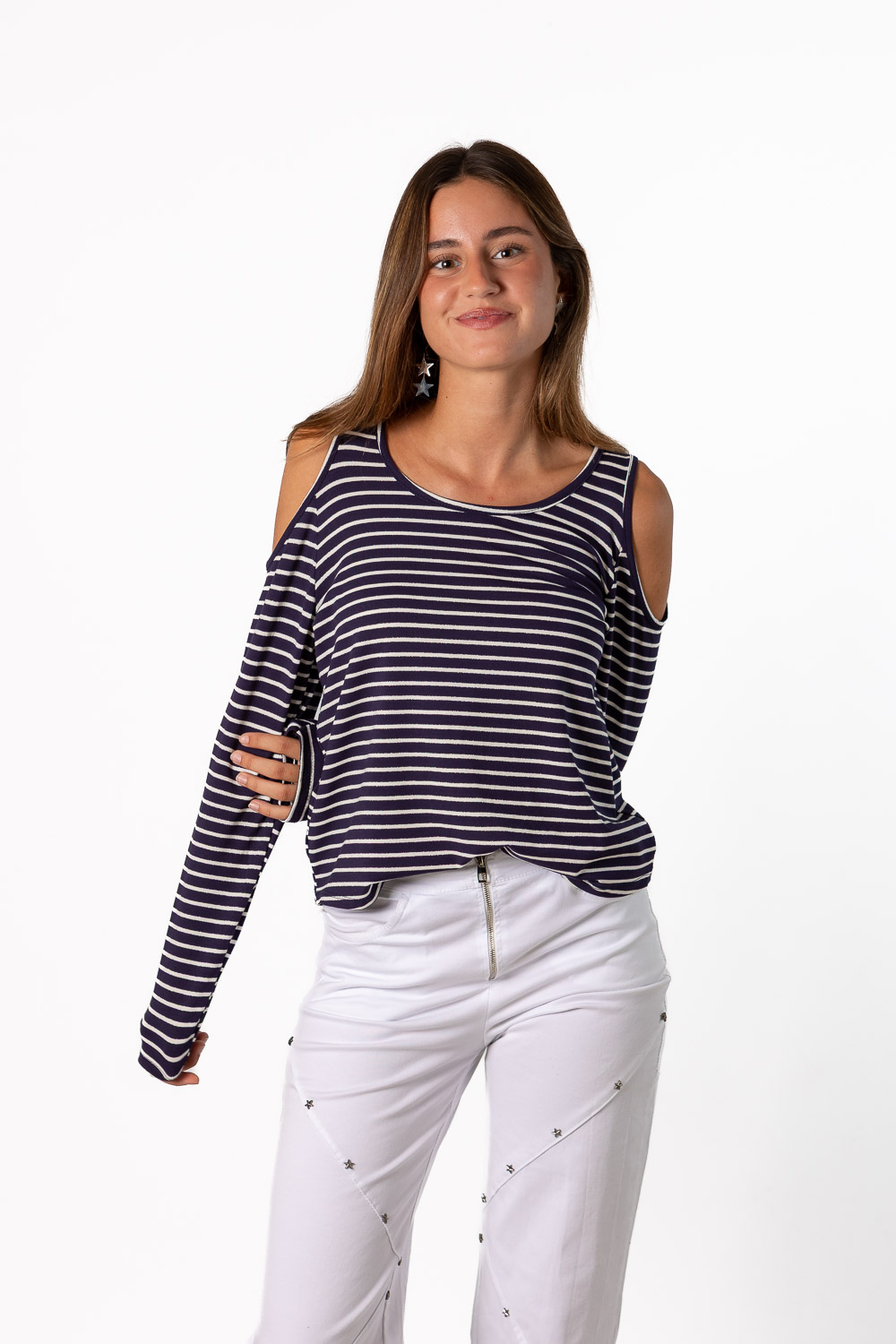 Jersey fino a rayas horizontales con aberturas en los hombros en color blanco y azul marino. Tiene un brillo discreto en las rayas que le da un toque especial. El tejido es muy gustoso y agradable al tacto. Es un jersey estilo camiseta de manga larga perfecto para los días de rutina. ¡Irás cómoda y con mucho estilo!