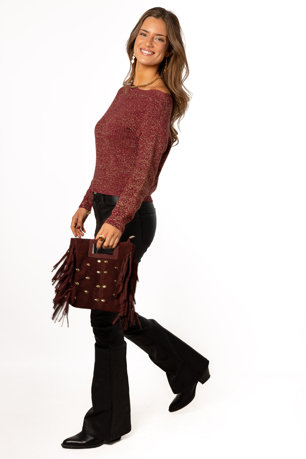 Jersey con brillo burdeos y dorado, perfecto para esas veces en las que quieres vestir más arregladita. El escote es ligeramente asimétrico y deja entrever un hombro. Es un poco oversize y corto, tiene mucho estilo. El tejido es muy gustoso.
