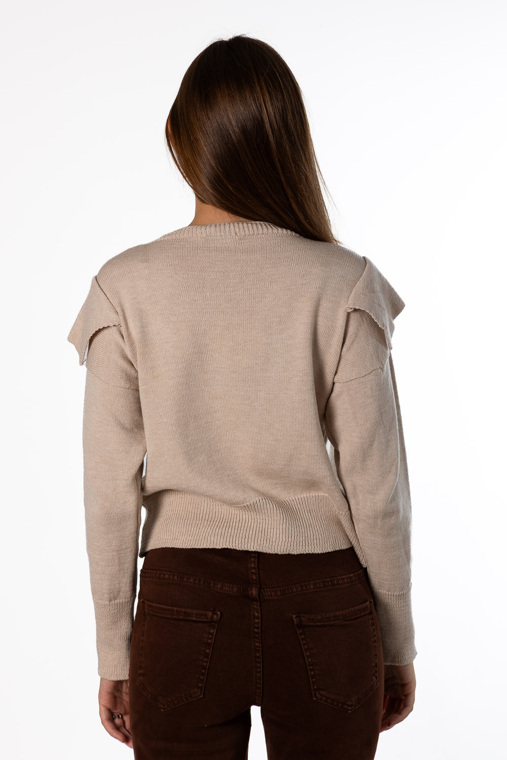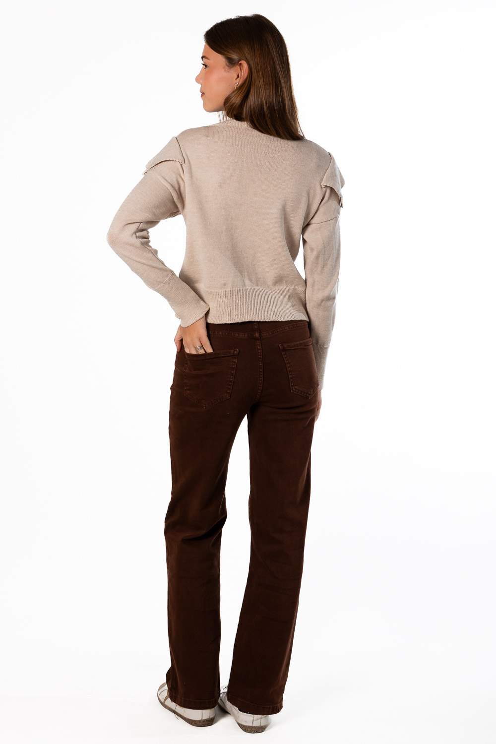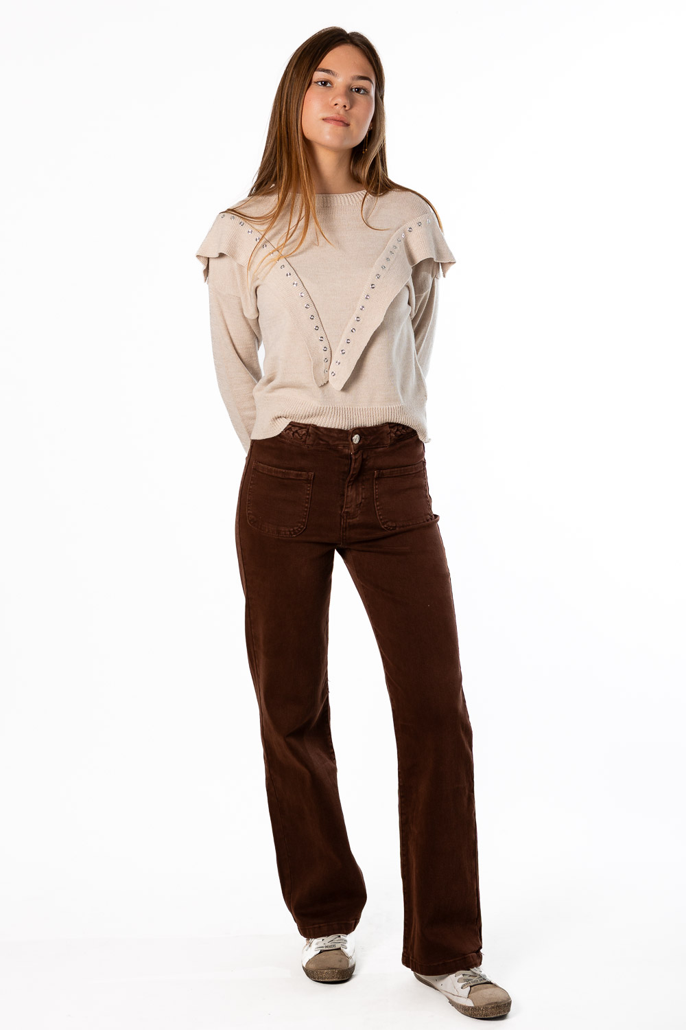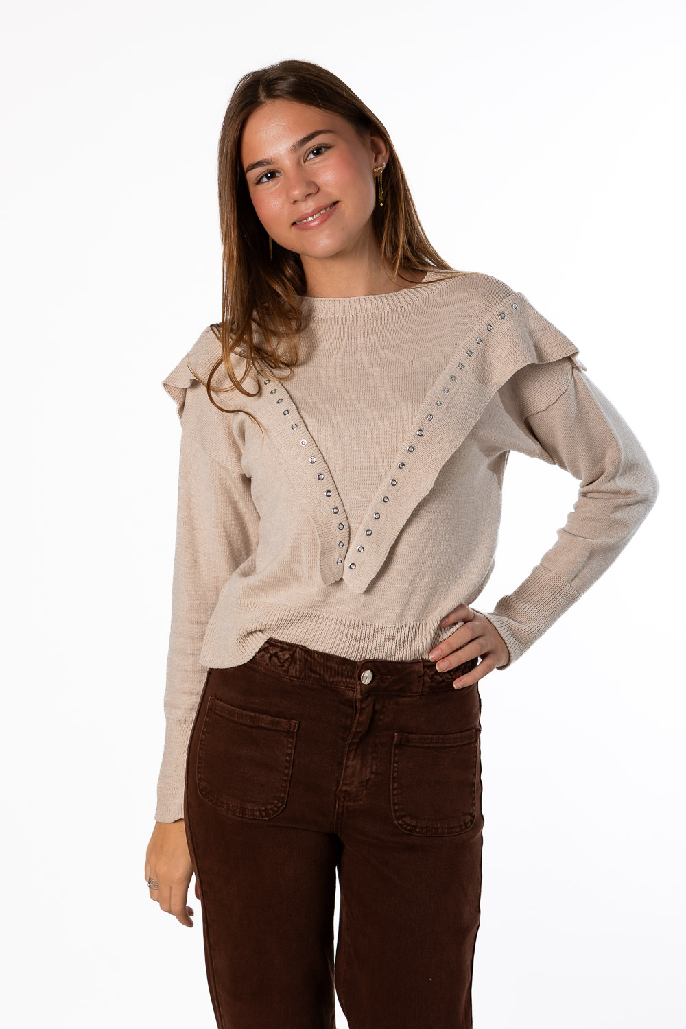 El jersey más gustoso y original de la temporada es nuestro Jersey Victoria. En forma de V, con volante y tachuelas, es un jersey exclusivo que siempre dará el toque diferente a tus outfits más casual.