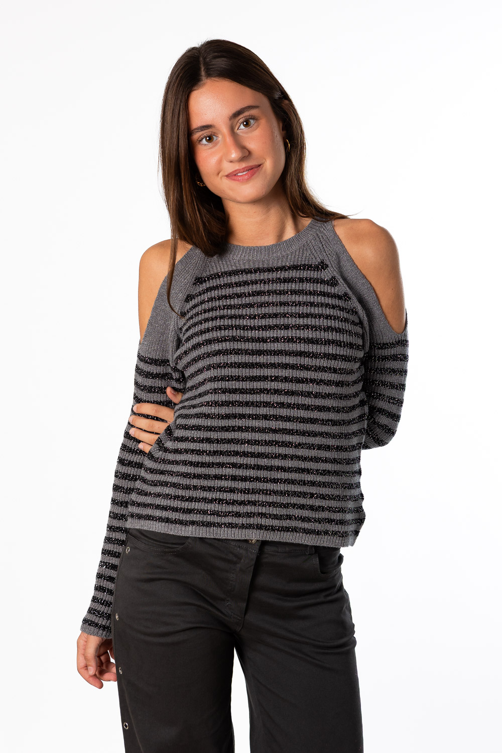 Jersey de rayas con doble abertura. La combinación gris y negro nos encanta. El hilo de este jersey es muy esponjoso, tiene brillito y es muy agradable al tacto. ¡Será uno de tus favoritos!