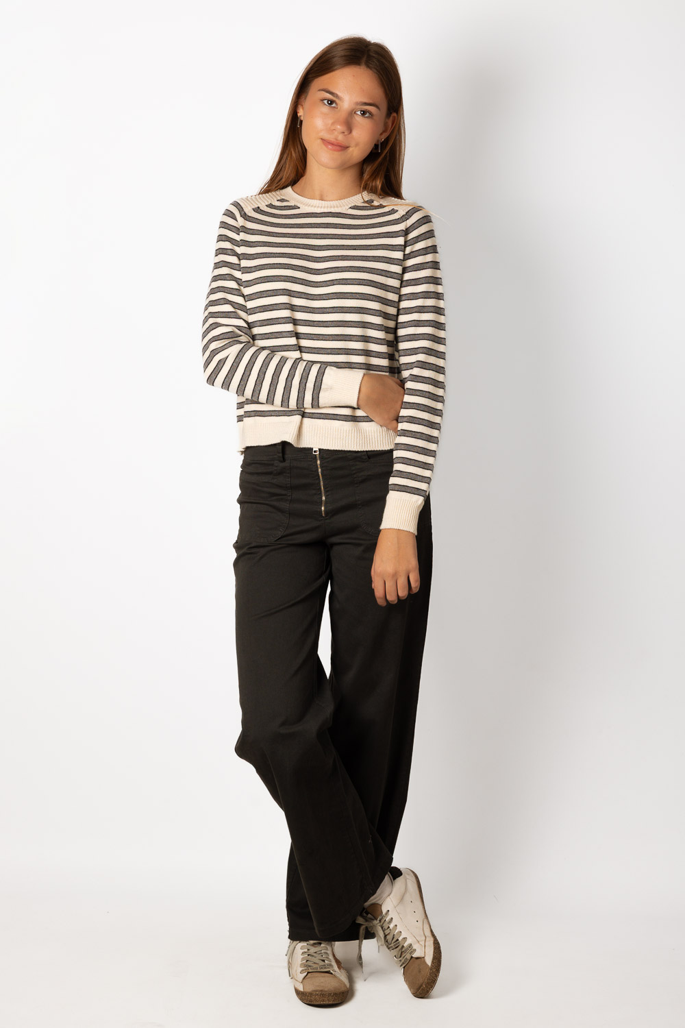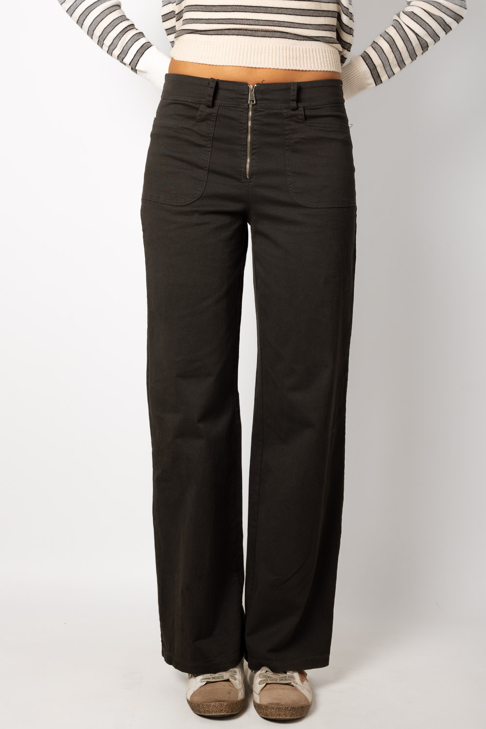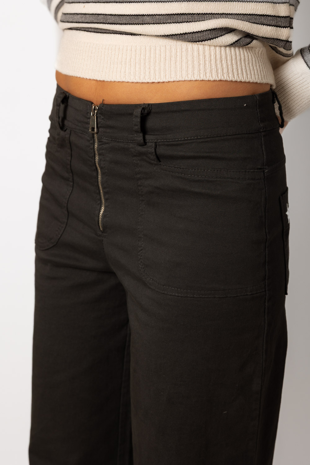 Pantalón largo gris sencillo por delante, de talle medio bajo con cremallera delantera y estrellas bordadas en los bolsillos traseros. Las tres estrellas son con hilo plata y nos flipa el contraste.