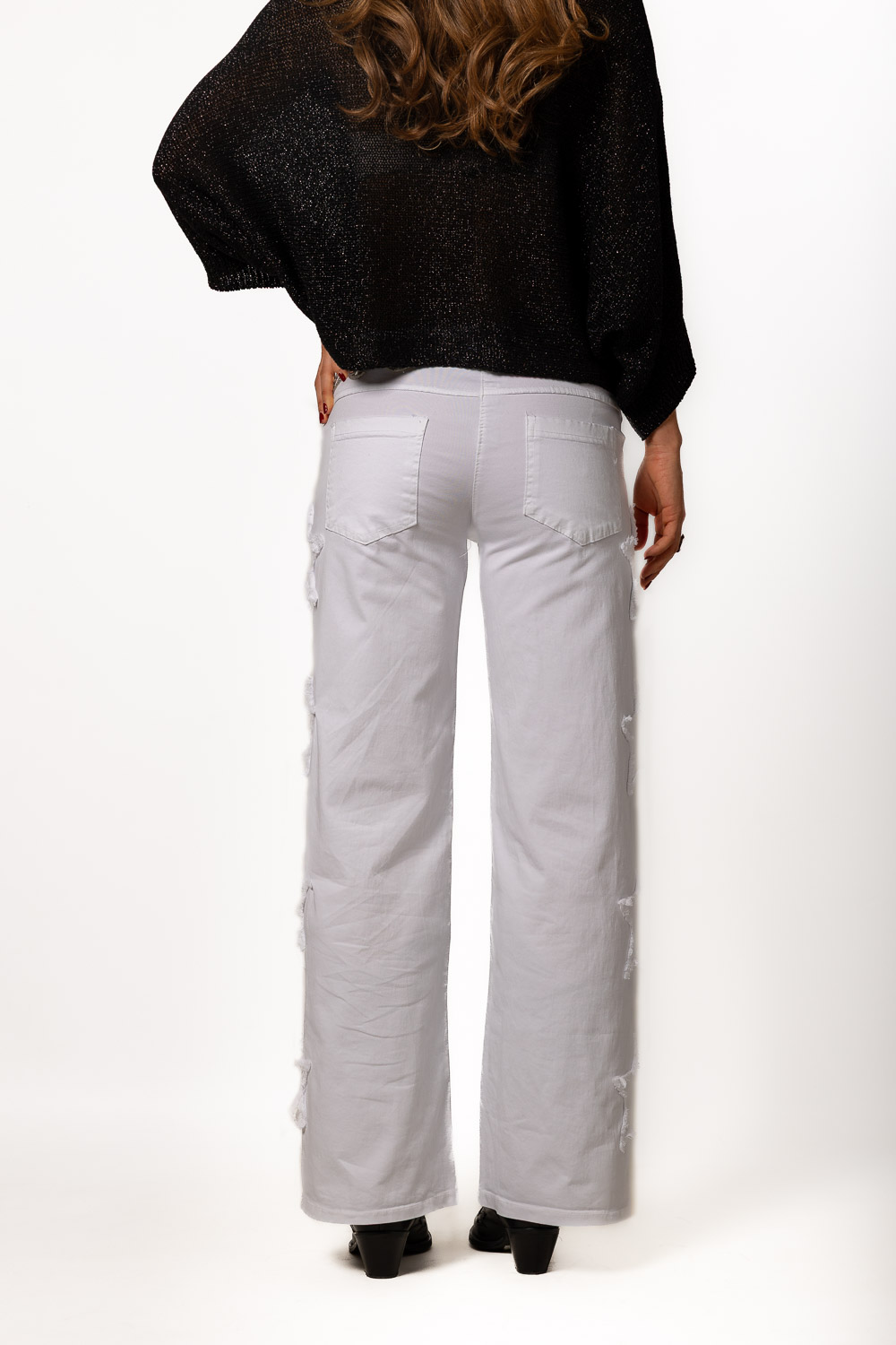 Pantalón largo blanco con estrellas laterales desflecadas estilo parche. ¡Los pantalones con más rollazo de Brookville! El color blanco es un must para todo el año, son súper ponibles y las estrellas estilo parche le dan un toque que nos flipa. Lo hemos combinado con la capa lurex brillo negro para darle un toque especial para estas fiestas. ¿Cómo los combinarías tú? Son unos pantalones muy versátiles. Elige tu talla, van a volar.