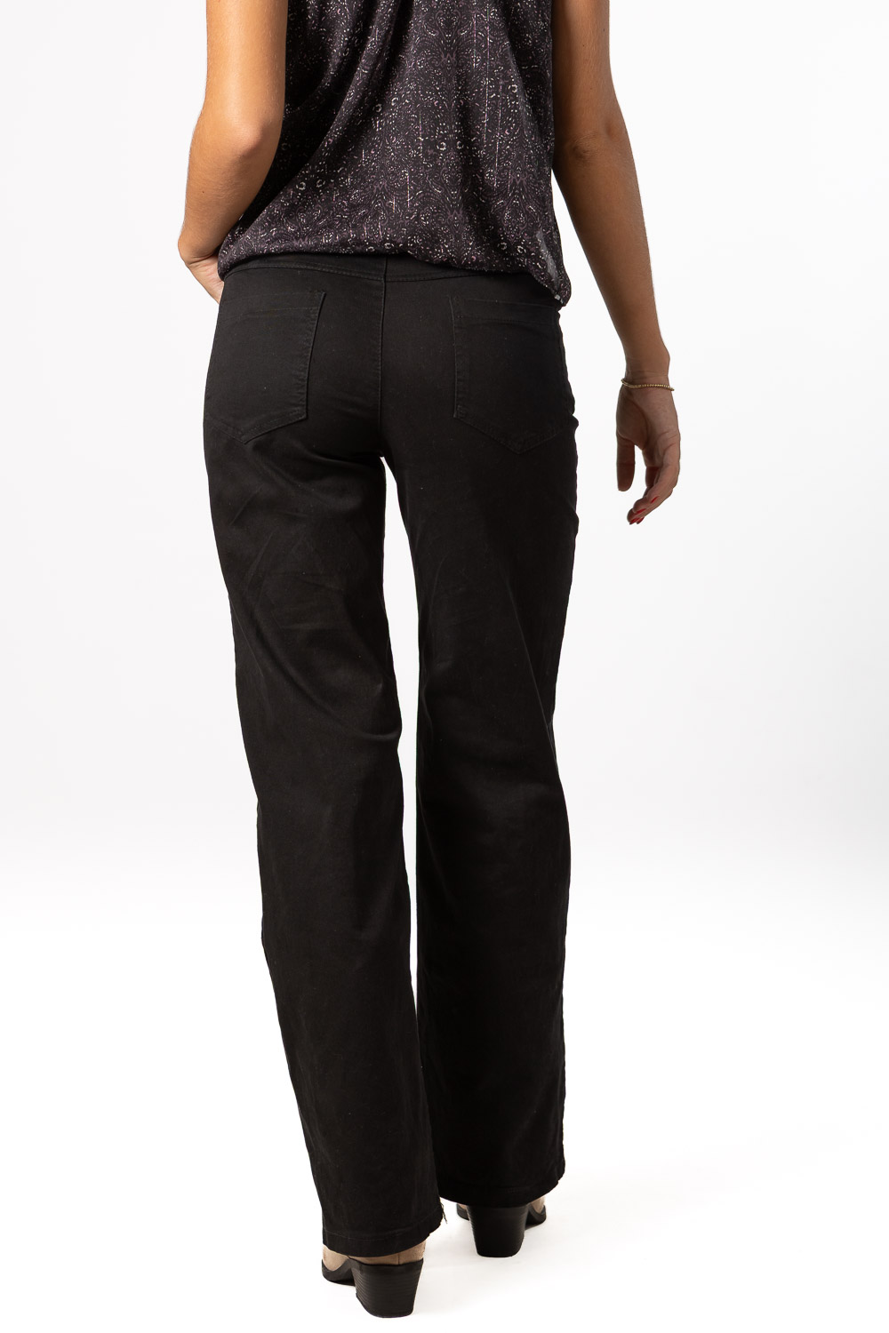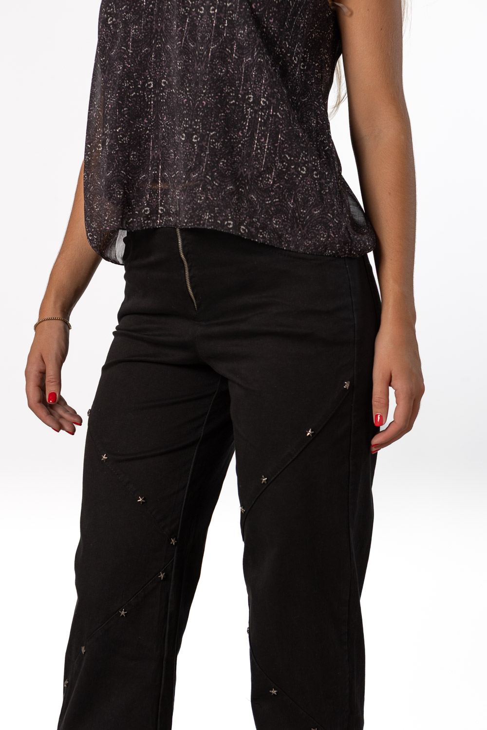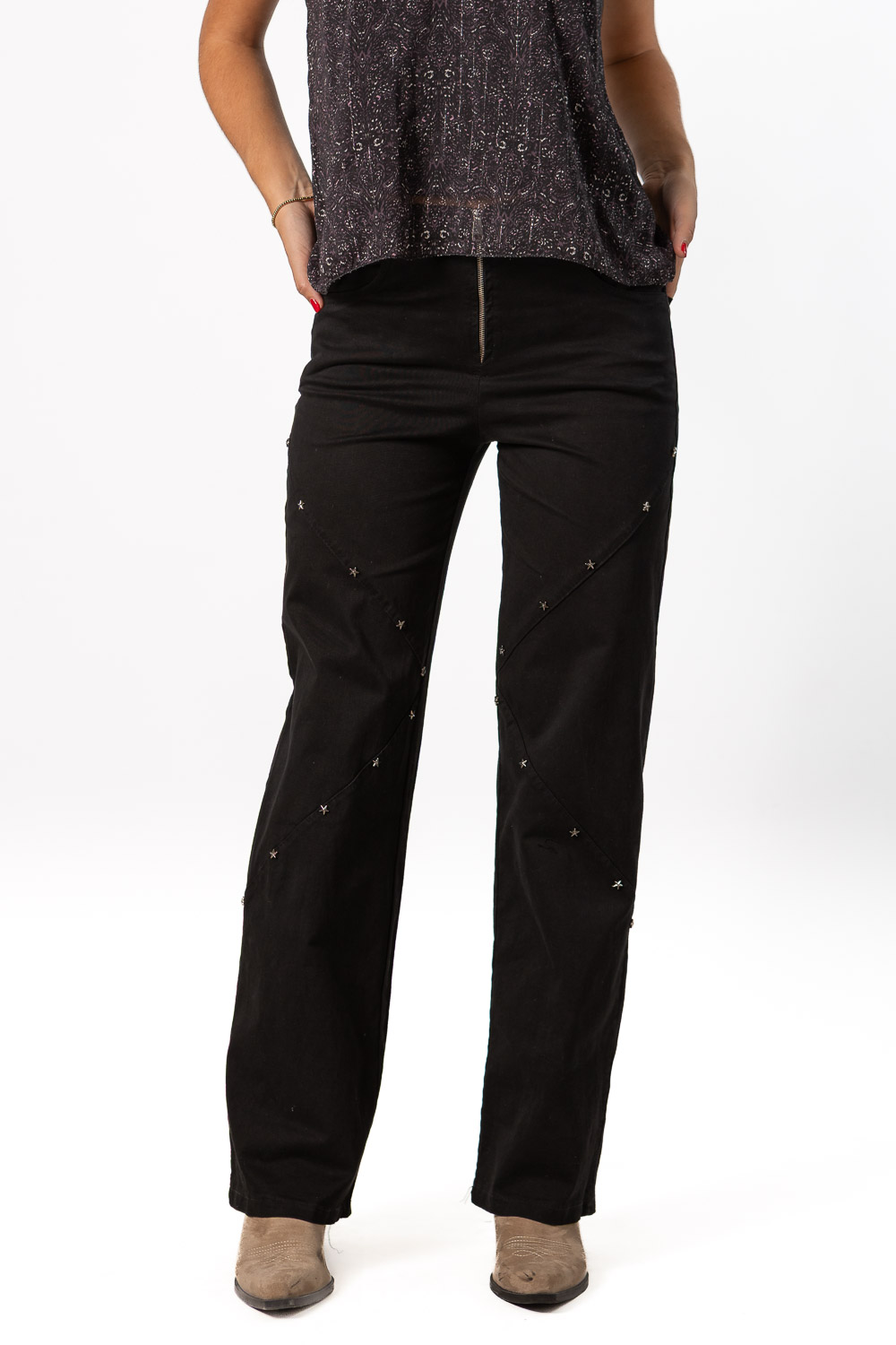 Pantalón negro recto con cremallera decorado con tachuelas de estrellas plata.