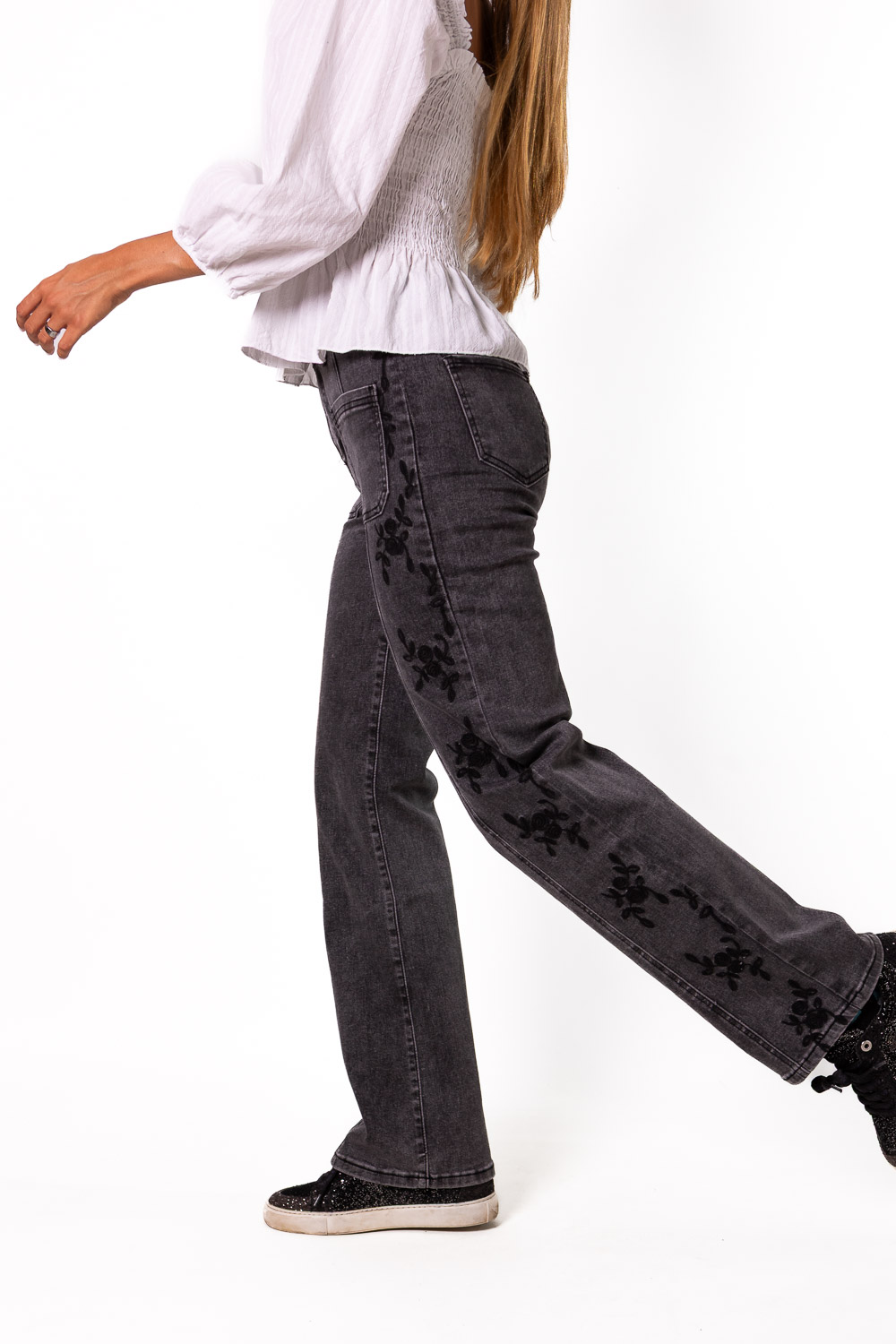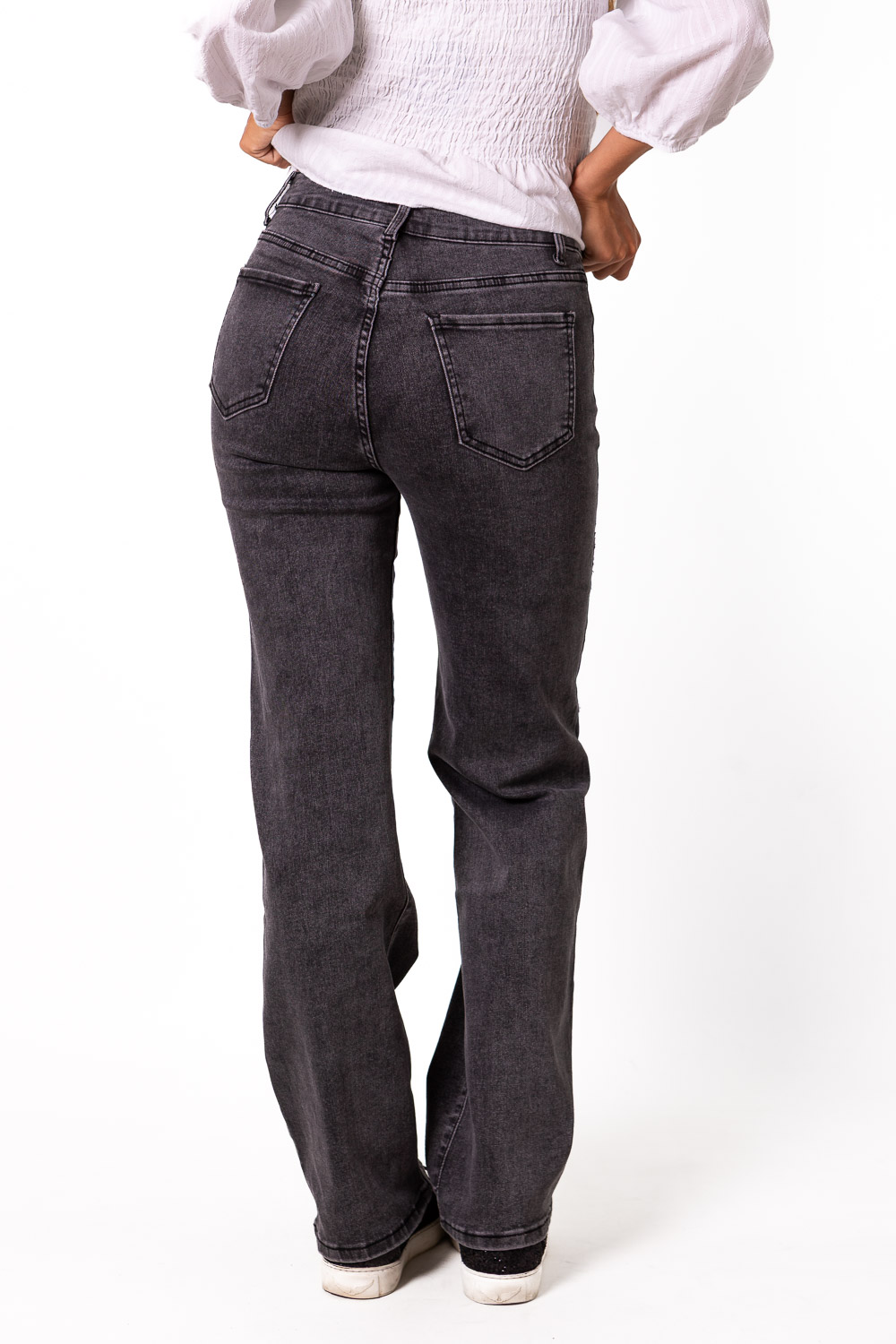 Pantalón vaquero gris oscuro, de talle alto, con bordados al tono. Estos vaqueros de corte recto son demasiado especiales. Sientan como un guante. Combínalos con prendas blancas en contraste para llamar la atención, ¡nos flipa cómo queda!