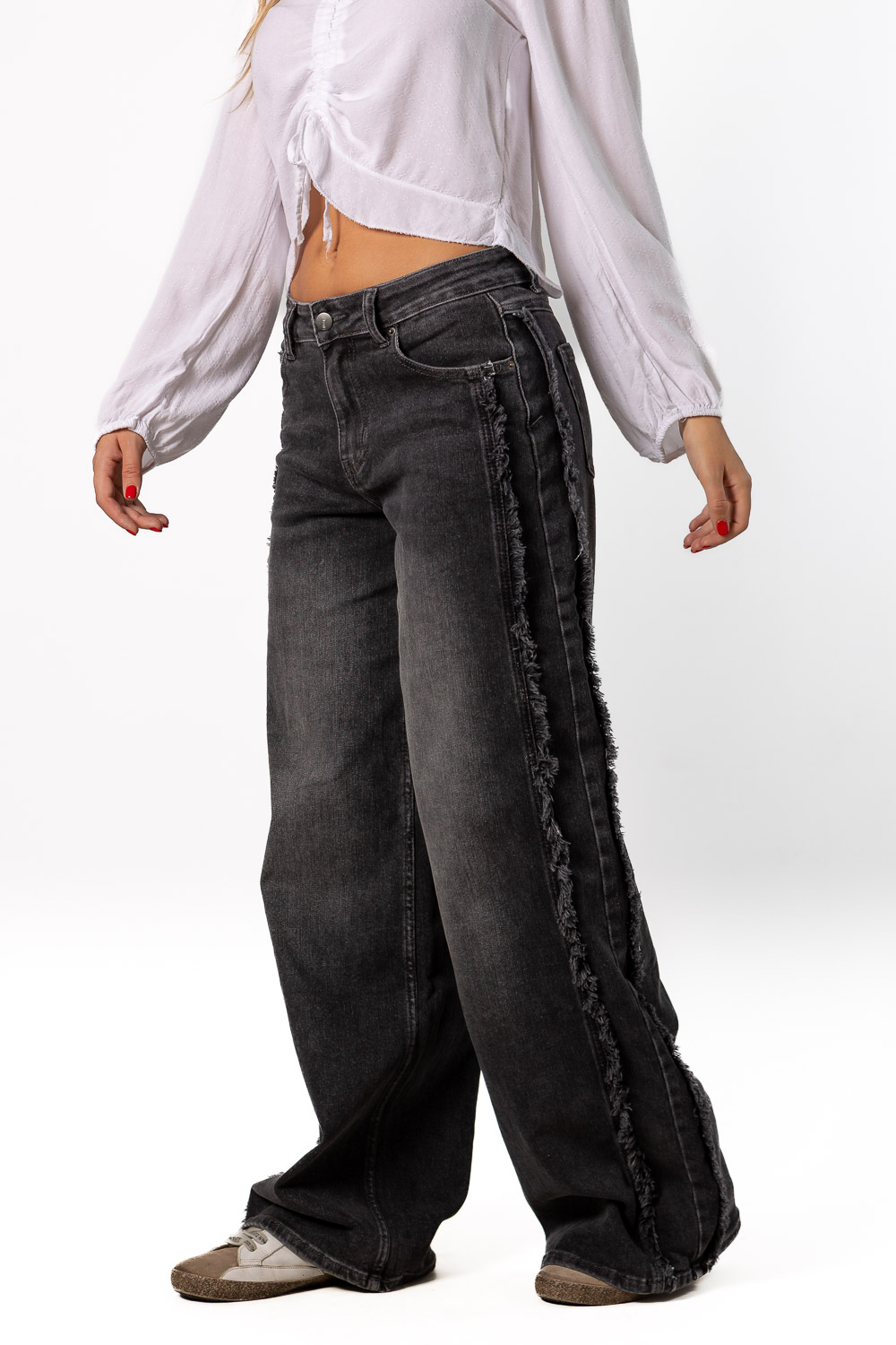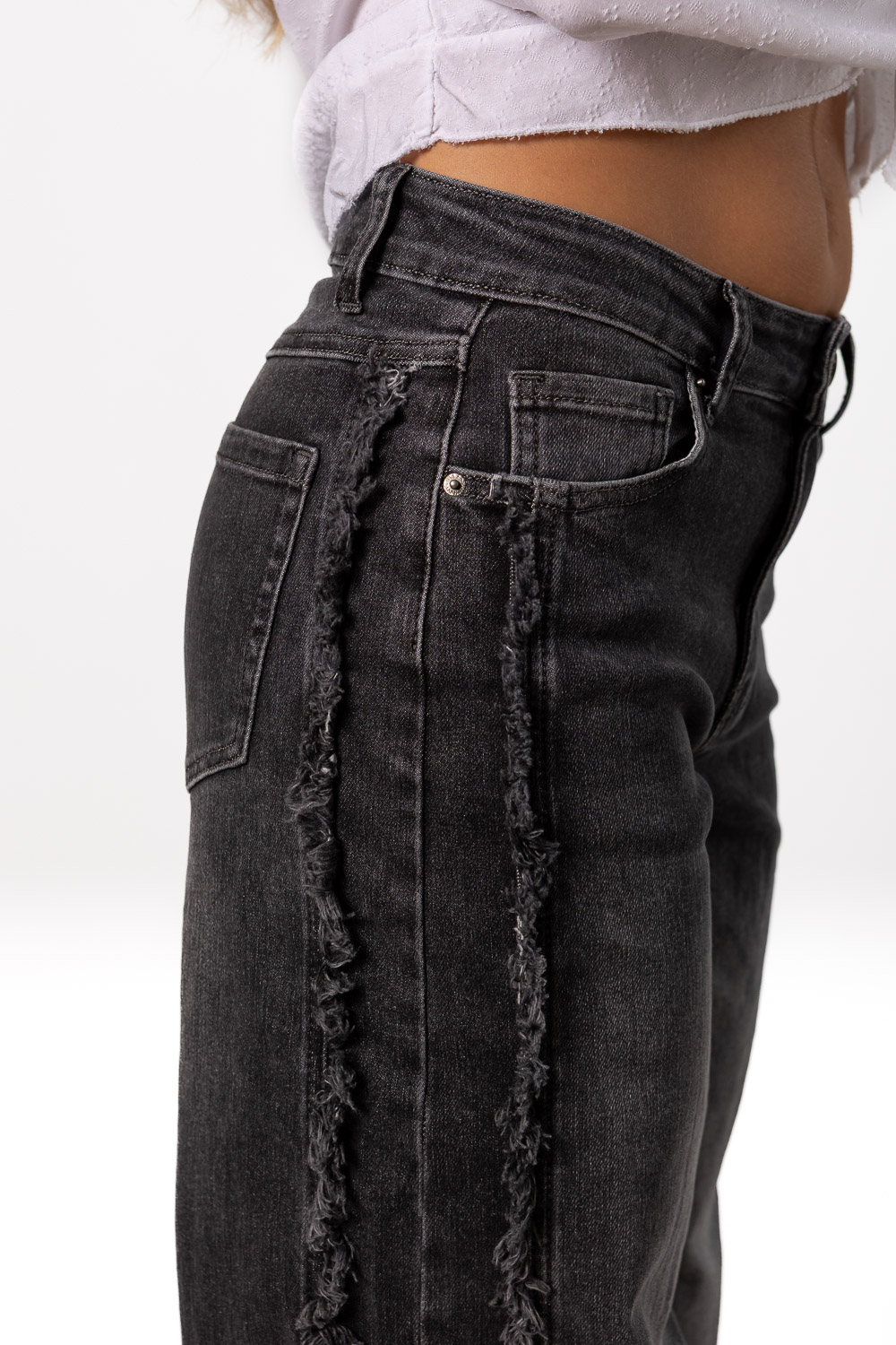 Pantalón de talle alto y corte recto con desflecado en los laterales ¡Nos flipan! Tienen un rollazo brutal. El tejido jeans es de un color gris lavado  que combina con todo, así que los necesitas. Son perfectos para ser esos vaqueros con estilazo que destacan en tu armario. Son elásticos. Un MUST para… todos tus planes del día a día.
