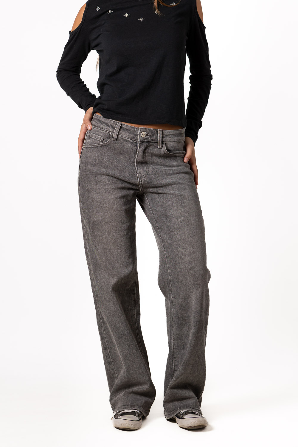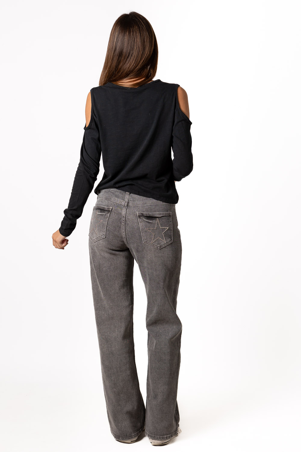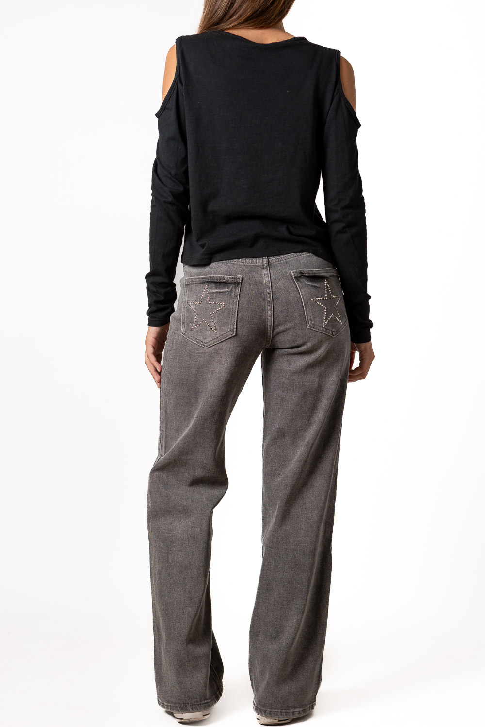 Pantalón vaquero gris con estrella con strass plateado en los bolsillos traseros. Son elásticos, un poco desgastados y de corte recto.