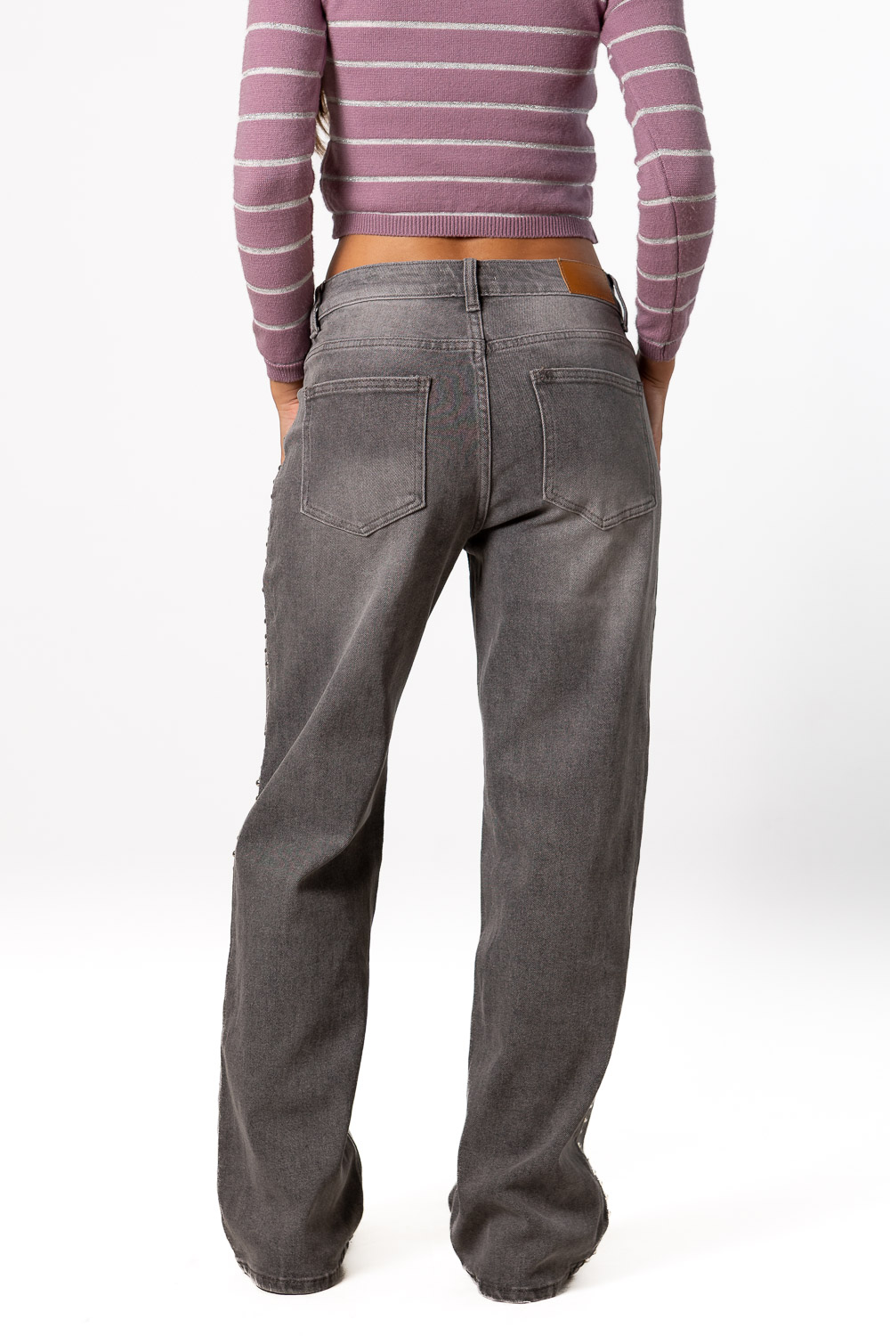 Pantalón vaquero  tachuelas, de talle medio, color gris, con tachuelas en los bolsillos y en toda la franja lateral. Son elásticos. Unos vaqueros de tachuelas cómodos y con estilazo.