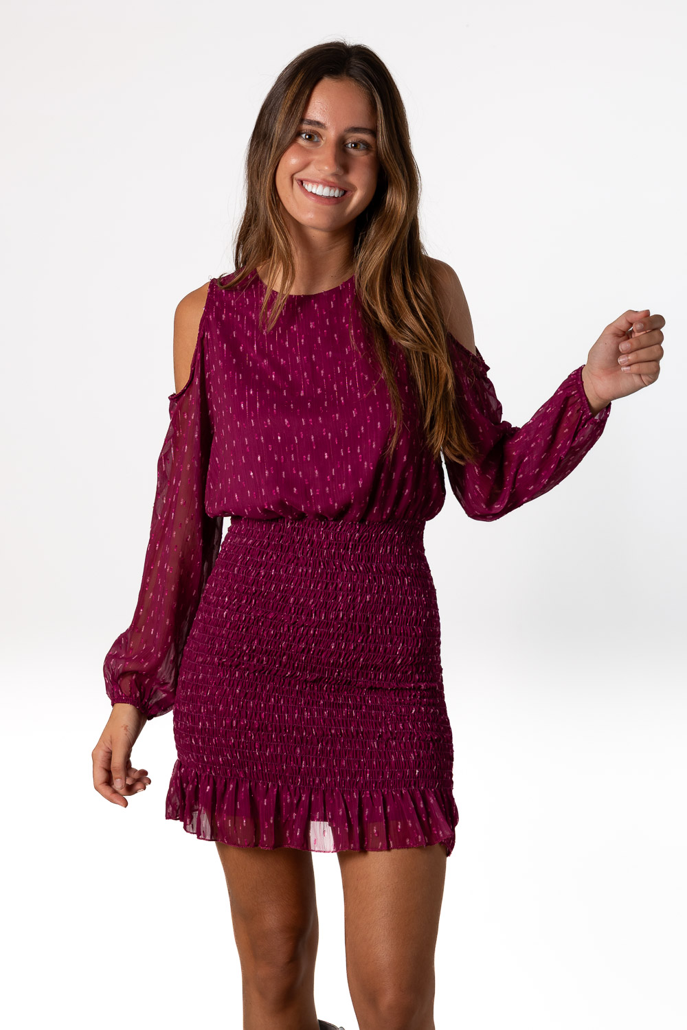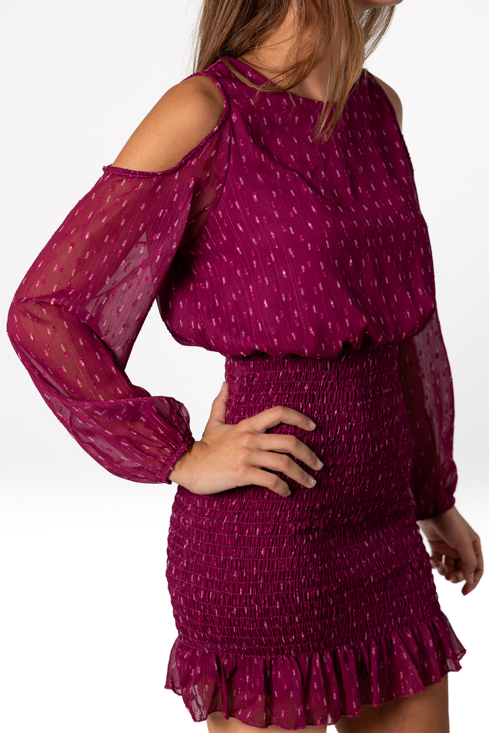 Vestido mini con aberturas en color frambuesa! Manga larga con tejido de gasa, lleva nido de abeja de cintura hacia abajo haciéndolo súper elástico! El print lleva plumeti y el color frambuesa favorece tanto!🤩 Aberturas en los hombros, dejándolos al descubierto.
