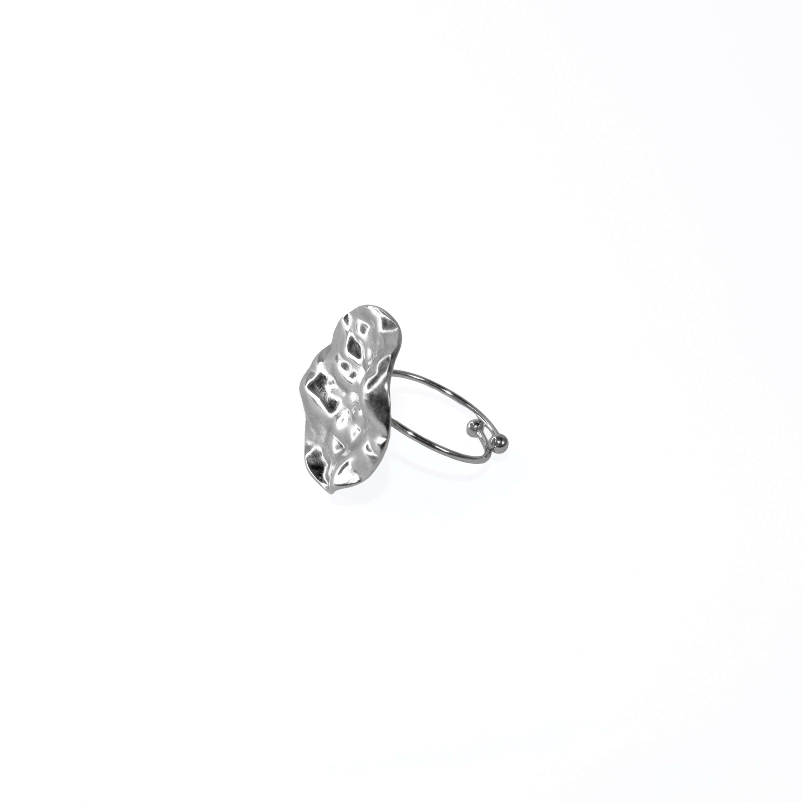 Anillo grueso plateado con forma de esfera redonda irregular.